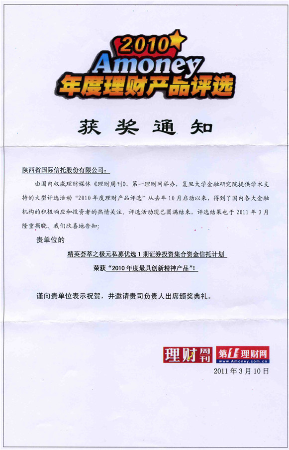 由《理财周刊》、《第一理财网》主办,于2010年10月正式启动的2010年度理财产品评选揭晓。在银行、基金、信托、保险行业2010年度推出的理财产品中共评选出了《年度最受关注产品》、《年度最具创新精神产品》、《年度最具竞争力产品》等奖项。我公司发行的“陕国投·精英荟萃之极元私募优选1期信托计划”荣获《年度最具创新精神产品》奖。