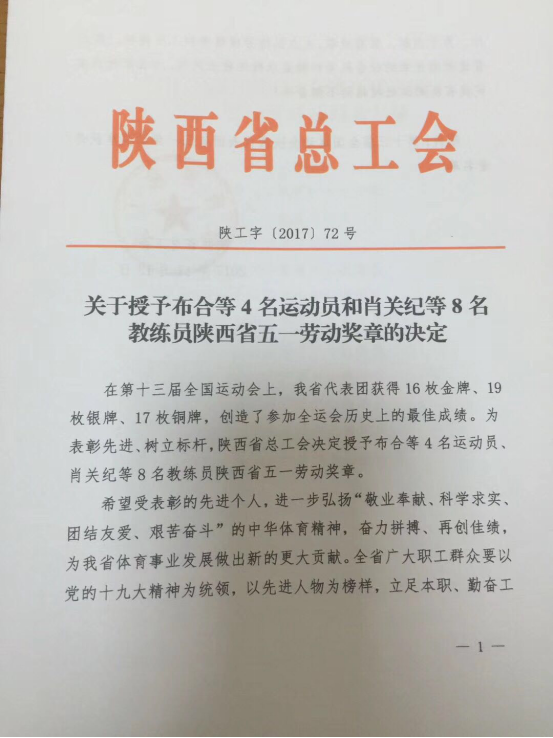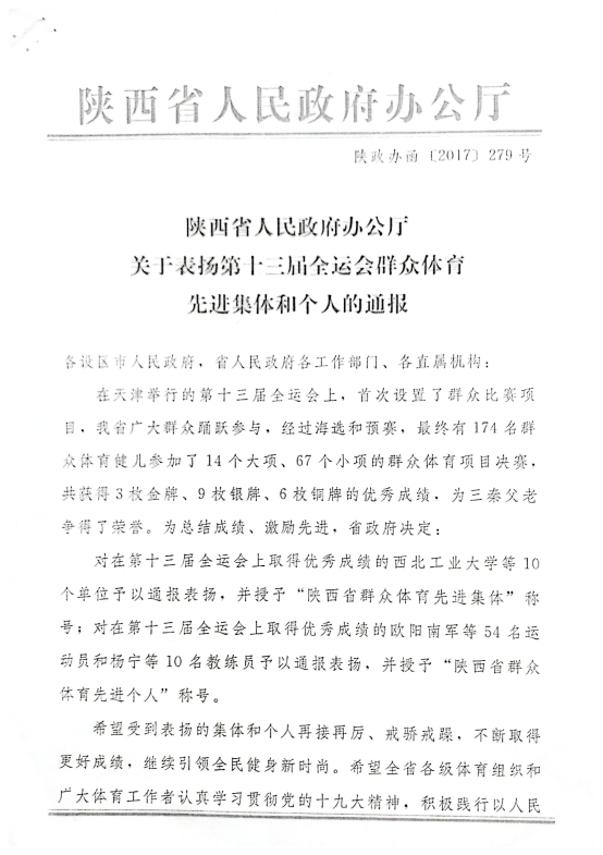 喜讯:陕西省人民政府办公厅授予公司员工杨力骁陕西省群众体育先进个人 及陕西省总工会授予公司员工杨力骁陕西省五一劳动奖章