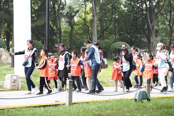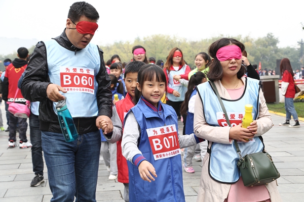 活动现场,近1000个小小志愿者和爸爸妈妈一起,手拉手陪伴100名视障儿童,共同环湖行走3.8公里。同时,家长们也蒙上眼罩,在小小志愿者引领下体验盲人的世界,以此培养“奉献、友爱、互助、进步”的志愿者精神。