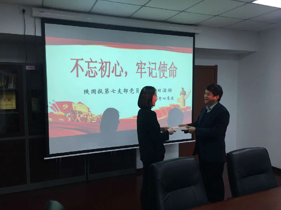 为认真贯彻落实习近平新时代中国特色社会主义思想和党的十九大精神,深入推进全面从严治党,进一步创新“三会一课”内容和形式,陕国投第七支部于2018年12月18日召开本年度第四季度党支部大会,举行“不忘初心,牢记使命”党员政治生日主题党日活动。公司副总裁王晓雁以普通党员身份参加,公司党委副书记何熙平同志、党委工作部副部长周小茹同志参会指导。