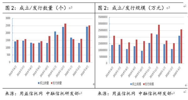 用益信托公布的数据显示,逐步复工后,3月集合信托市场发行和成立市场出现强势反弹。具体来看,2020年3月共有59家信托公司参与发行,56家信托公司成立产品。其中发行产品数量2512个,环比上涨57.9%,成立产品数量2439个,环比上涨85.8%;发行和成立产品规模方面同样表现良好,其中发行市场规模2572.08亿元,环比增长66.7%,成立市场规模2103.57亿元,环比上涨92.2%。发行和成立规模在放在2019年来看,也仅低于12月,规模排在第二位。