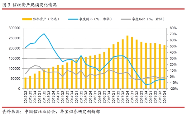 从2018年一季度开始,信托资产规模连续8个季度下滑。究其原因,一方面与监管的收紧有关,倒逼信托公司主要压缩通道业务规模,持续向回归信托本源、服务实体经济、强化主动管理能力的方向转变;另一方面,也与宏观经济增速持续下台阶有关,信用风险抬升,信托公司获取合适资产的难度加大。到了2019年,这两个因素依然存在,不过政策带来的影响在边际上有所改善。在经济下行压力增大的背景下,宏观政策逐步转向“稳增长、稳杠杆”,“宽货币+宽信用”的政策组合使得经济增速预期好转,融资需求有所回暖。同时,央行关于资管业务的通知允许银行自主制定整改计划,有助于稳定银信合作中的银行表内和表外的资金规模,避免银信合作规模过快下降。银行理财可投非标的明确规定将消除监管不确定性,非标资金端的改善有望带来银信融资类业务降幅趋缓。部分存量信托产品具有资金池特征,资管新规过渡期内允许资金池类信托产品滚动发行对接新资产,有利于减缓信托规模的下降。这些积极因素推动下,使得信托规模压降的速度在2019年上半年有所放缓。不过在2019年下半年,对于通道业务和房地产信托的监管加码,通道业务和房地产信托业务均受到比较大的影响,信托规模压降的速度重新扩大。