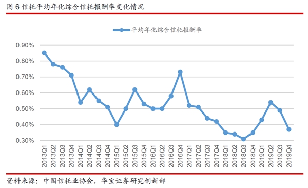 从上述两个角度来分析信托产品的结构我们可以发现,“资管新规”落地后,通道与多层嵌套业务不断清理与压缩,信托公司主动管理能力增强,信托业务结构优化。这带动了信托报酬率从2018年四季度开始连续3个季度的回升,2019年二季度平均年化综合报酬率为0.54%,相对于2018年三季度的阶段性低点提高0.23个百分点。不过由于2019年下半年监管部门加大了风险排查的力度和频率,之前被隐匿的风险得到了更加充分的暴露,使得信托报酬率在下半年出现了回落。