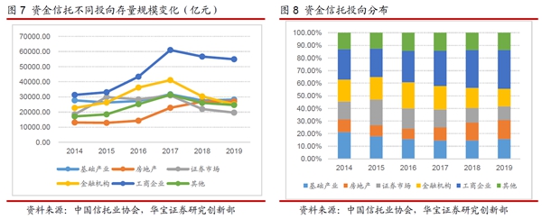 从纳入资管新规的资金信托的情况来看,截止2019年末,资金信托规模为17.94万亿元,较2018年末下降1.01万亿,同比增速-5.35%。
