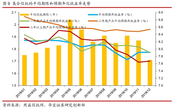 对于信托产品收益率的研究,我们可以参考用益信托网提供的集合信托的数据。根据用益信托网不完全数据显示,2019年,已公布的集合理财类信托产品的平均收益率为8.16%,与2018年相比平均收益率上行22个bp;其平均信托年限为1.86年,与2018年持平。