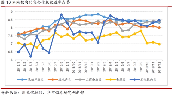 产品收益:根据用益信托网不完全数据显示,2019年,已公布的集合理财类信托产品的平均收益率为8.16%,与2018年相比平均收益率上行22个bp;其平均信托年限为1.86年,与2018年持平。从预期年化收益率的趋势来看,2019年月度新发集合信托平均预期年收益率呈明显的下降趋势。疫情加大经济衰退风险,全球流动性大幅投放,“资产荒”的压力进一步增大,预计2020 年集合信托产品的平均预期收益率仍然有一定的下行空间。