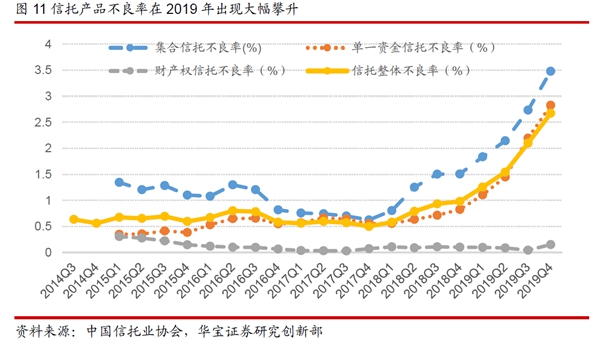 不良率快速攀升。具体来看,信托整体的不良率由2018年末的0.98%上升至2019年末的2.67%,不良率上升1.69个百分点;集合信托的不良率由2018年末的1.51%上升至2019年末的3.48%,上升了1.97个百分点;单一资金信托的不良率由2018年末的0.83%上升至2019年末的2.82%,上升了2个百分点。2019年单一资金信托的不良率上升的比集合信托要快,不过当前集合信托的不良率仍高于单一资金信托。