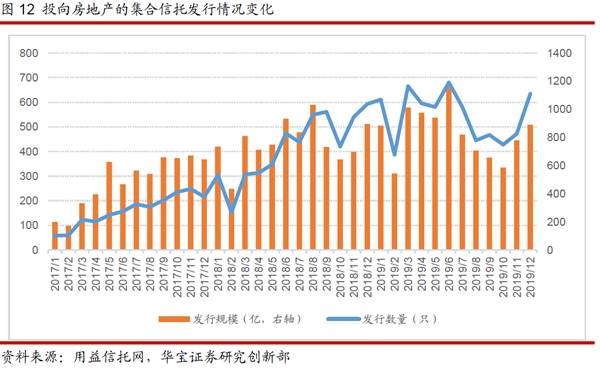 用益信托网统计的房地产类集合信托的数据显示,2017-2019年三年房地产类集合信托发行规模分别为5921亿、9209亿和9965亿元,2018年和2019年的同比增速分别为55.54%和8.2%。就2019年来看,上半年发行规模明显上涨,而下半年则有所下降。具体来看,2019年上半年房地产类集合信托发行规模5525亿,同比增加26.33%,而下半年发行规模4440亿元,同比下降8.19%。主要原因在于:以5月17日“23号文”的发布为标志,地产调控进一步收紧,尤其地产融资的多个渠道均受到了明显的限制。5月,银保监会发下“23号文”,要求不得向“四证不全”、开发商或其控股股东资质不达标、资本金未足额到位的房地产开发项目直接提供融资;2019年7月和8月,银保监会对部分房地产信托业务增速过快、体量较大信托公司进行约谈,继续保持房地产信托调控力度,并进行余额管控,即每日时点规模不得超过6月30日之前的房地产信托规模。在监管压力之下,使得投向房地产的信托资金规模快速“刹车”。