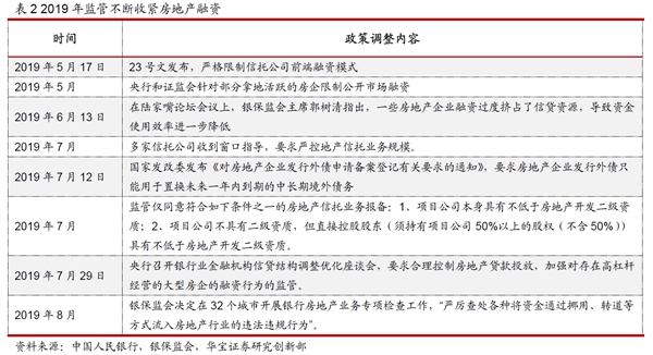 2016年国庆之后,尽管房地产调控政策不断收紧,但是地产投资受到的影响比较小,地产投资增速持续上涨后维持在高位,2017-2019年三年房地产投资增速分别为7%、9.5%和9.9%,同时限购、限价、限贷、限售政策对于房地产开发商的资金回收形成较大影响,同时银行等常规融资渠道也受到了限制,信托融资由于其灵活性受到了地产商的青睐。随着2018年资管新规及其配套的各项政策的落地,政策的不确定性消除之后,房地产融资出现明显回升,一直持续到2019年上半年。由于在2019年5月份开始政策对房地产的融资监管进一步收紧,2019年下半年地产融资明显回落。
