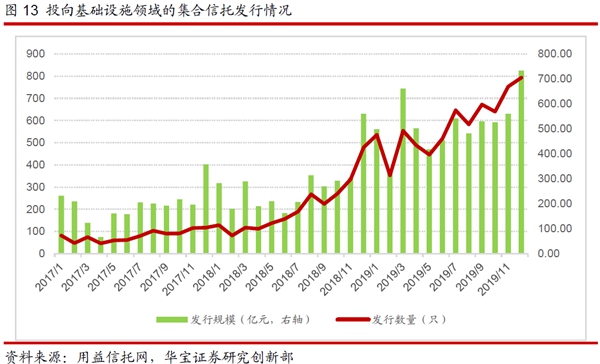 在传统信托业务中,房地产信托和基础设施信托业务受宏观经济和政策的影响较大,业务波动较大,同时这两类信托的基础资产是房地产和政府平台,当前的风险发生率要小于工商企业,是比较受投资者欢迎的两类产品。为了更好地观察地产信托和基建信托的业务发展状况,我们选择更高频(月度)且公布较为及时的用益信托网上披露的月度集合信托新发行数据作为研究的参考数据。
