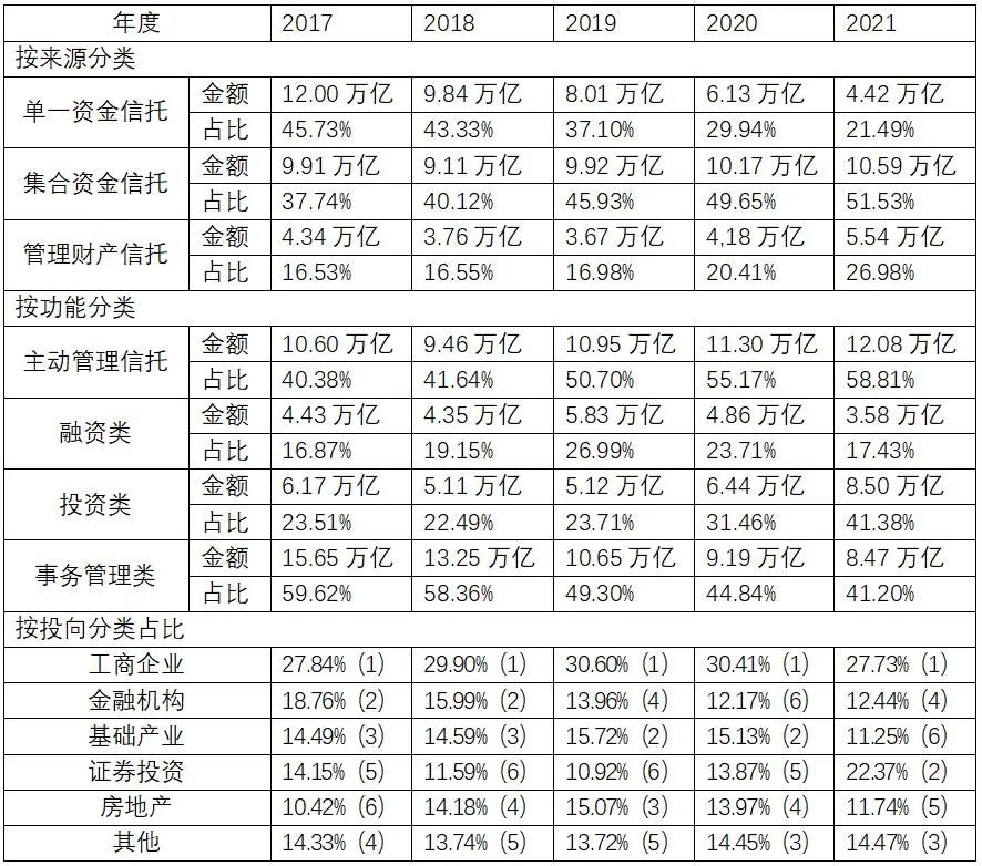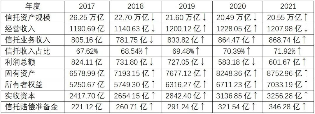 表一 2017-2021年信托业规模、业绩和资本变化一览表